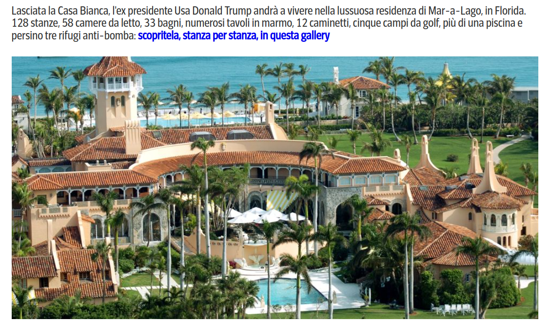 beh, almeno ci sono tanti ricchi come questo 'marito di soetoro' fans del movimento 'TAX THE RICH' ... gates, buffett, ecc. ecc. .... certo, lo dicono mentre fanno tutto quello che possono per pagare il meno possibile corrompendo pure i decisori politici ... ma almeno dicono 'per favore tassateci' , una roba che trump (quello con la casetta letteralmente d'oro massiccio e la seconda casetta qui sotto per le ferie) MAI si è sognato di dire