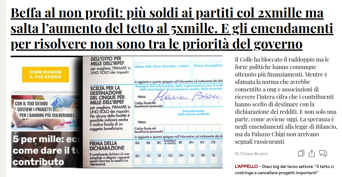 ehhhhh, mi ricordo quando devolvevo volentieri gran parte della tredicesima a favore di varie ong... poi sono arrivati gli 8, i 5, i 2/1000 e adesso non devolvo più nulla (in questo modo è molto calata la quantità di denaro che va dalle mie tasche a quelle delle ong): è lo stato, bellezza