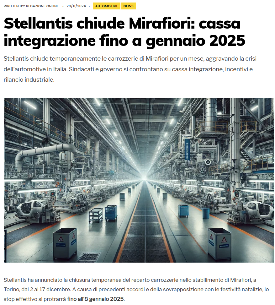 se ne è andato tavares e in Germania sciopero ad oltranza dei bipendenti VW.... nessuna azienda può salvarsi con le sue sole risorse contro le aziende cinesi che hanno a supporto totale la Cina, qui c'è lo XTOLT libertario che ciancia di 'privato superiore' ma è una cazzata mai esistita nella storia umana e impossibile da realizzarsi e lo capisce anche un bimbo dell'asilo